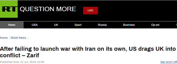 “今日俄罗斯”(RT)称,扎里夫此番言论是将德黑兰和伦敦之间连续不断的争吵归咎于华盛顿。他认为美国才是幕后的操纵者,并试图借此加大对伊朗的施压。RT还将扎里夫此言解读为,他在指责“华盛顿战争鹰派”,在美国总统特朗普取消对伊朗的军事打击后,“华盛顿鹰派”转向英国,希望能把英国拖入泥潭。