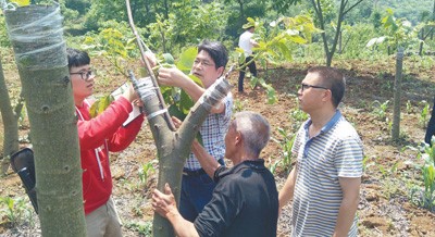 潘学军(左二)在田间传授农户核桃高接后的管理。