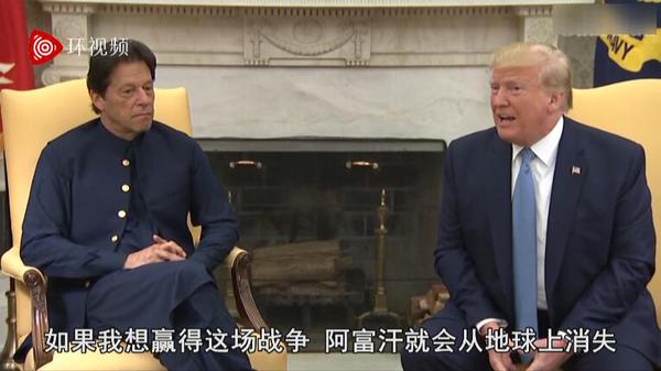(特朗普22日在白宫会见来访的巴基斯坦总理伊姆兰·汗,现场视频截图)