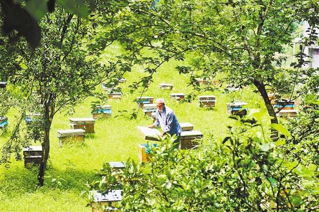 花丛中,蜜蜂“嗡嗡嗡”地忙个不停;林荫下,一位头发花白的老人,正在巡查蜂箱。