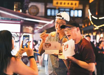 游客在上海豫园夜市开心地品尝当地特色小吃生煎包。 新华社记者 刘 颖摄