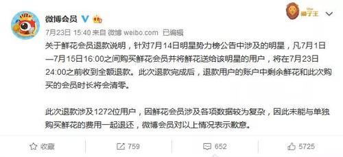 7月23日下午,新浪微波再次通过@微博会员发布公告,承诺将7月1日-7月15日16:00之间购买鲜花会员并将鲜花送给该明星的用户,在7月23日当天24点之前完成全额退款,并再次向用户表示歉意。