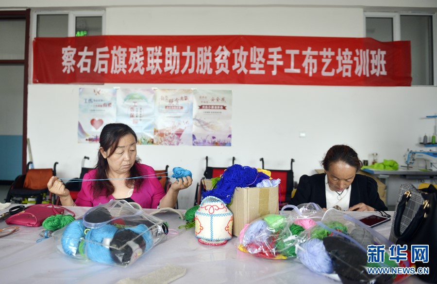 乌兰察布市察右后旗三宝民族服饰制造有限公司扶贫车间内,几名妇女正在接受手工布艺培训。
