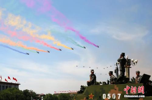 资料图:2015年9月3日上午,纪念中国人民抗日战争暨世界反法西斯战争胜利70周年大会在北京隆重举行。图为直升机梯队飞越天安门广场,接受检阅。中新社记者 韩海丹 摄