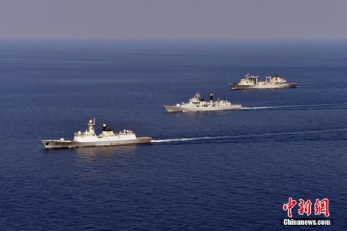 资料图:第二十二批护航编队与第二十三批护航编队分航。 中新社记者 张海龙 摄
