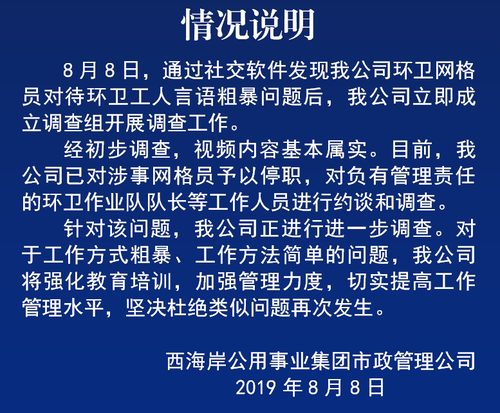 针对网传“环卫网格员对待环卫工人言语粗暴”一事,山东青岛西海岸公用事业集团市政管理公司8月8日发布情况说明称,经初步调查,视频内容基本属实。目前,已对涉事网格员予以停职,对负有管理责任的环卫作业队队长等工作人员进行约谈和调查。
