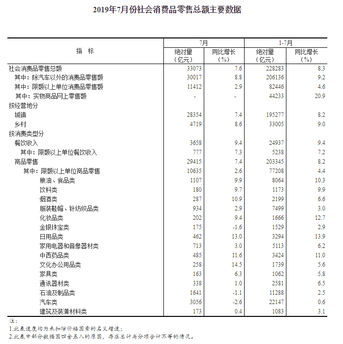 统计局:7月社会消费品零售总额增长7.6%