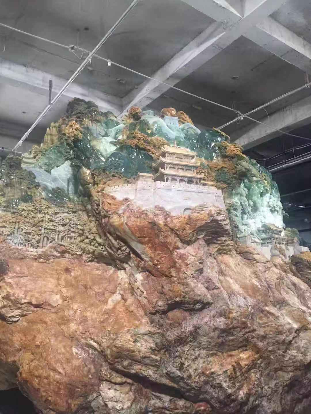 融合绵延八千年玉文化、万里长城这两大中华文明传统元素的巨型玉雕“长城”,是在一块单体重达118吨的岫岩玉石原体上进行设计与雕琢而成,该玉料采自岫岩县哈达碑玉石矿,玉石原体为花玉(又称七彩玉)类型,呈不规则形状,它长近6.5米、高逾3米、厚近4米,最大周长近17米。与一般花玉含玉量不足30%不同,这块确定雕琢“长城”的巨型玉石“非常神奇”,剖开后发现其含玉量高达98%。