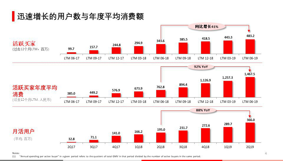 ▲截至2019年6月底,拼多多平台年活跃买家数达4.832亿,同比增长41%;移动客户端平均月活用户达3.66亿,同比增长88%;数据显示拼多多成618获客王,进入新的用户爆发周期开始。
