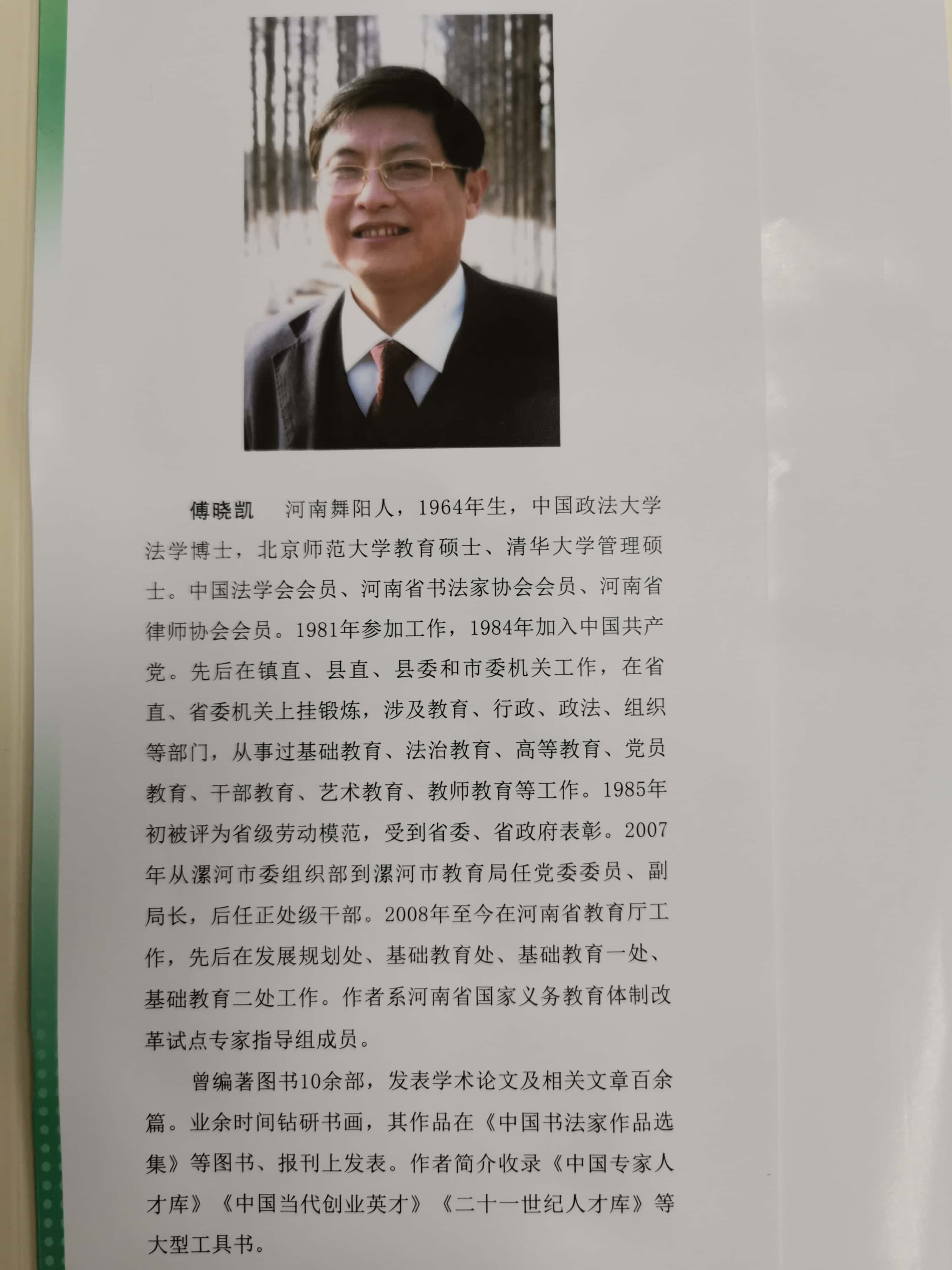 傅晓凯,法学博士、教育学、管理学硕士。国家义务教育体制改革试点专家指导组成员,河南省教育厅基础教育处工作。《教育方法与教育生态创新研究》是傅晓凯博士的最新力作。国家教育部司长姚喜双认为,作者首次在中国教育界提出了“四层五环”大教育生态圈理论。