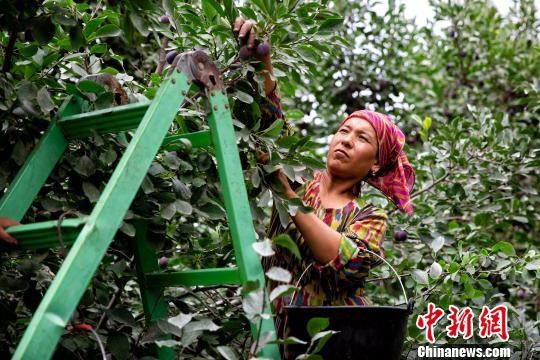 新疆伽师县农民在林间采摘伽师新梅。