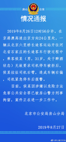 北京市公安局房山分局官方微博@房山警方在线8月27日发布情况通报称,8月26日12时26分许,在京港澳高速出京方向24公里处,一辆从北京六里桥长途客运站开往河北石家庄的长途客车行驶过程中,乘客侯某(男,31岁,处于醉酒状态)无故要求司机停车被拒后,侯某拉扯司机右臂,造成车辆右偏,司机紧急停车后报警。