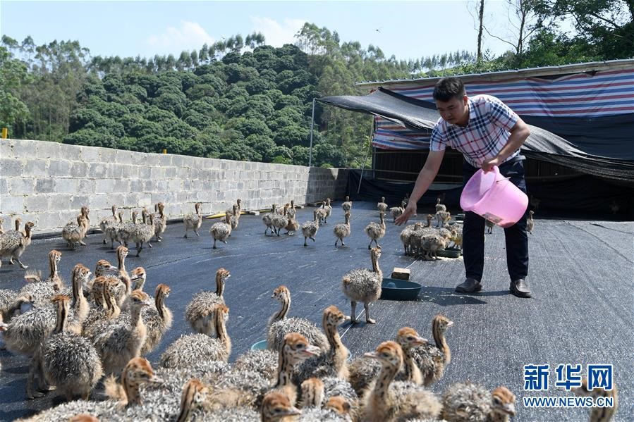 8月29日,工作人员在广西玉林市福绵区樟木镇忠荔村鸵鸟养殖基地给小鸵鸟喂食。