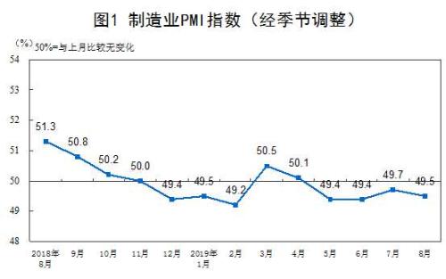 2019年8月份,中国制造业采购经理指数(PMI)为49.5%,比上月小幅回落0.2个百分点。