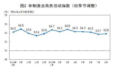 2019年8月份,非制造业商务活动指数为53.8%,比上月提升0.1个百分点,显示非制造业总体保持扩张势头,增速略有加快。