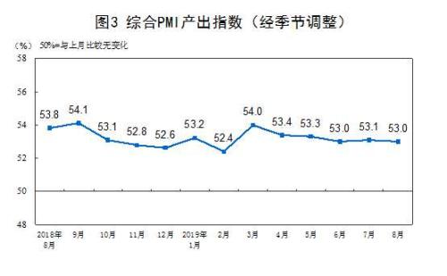 2019年8月份,综合PMI产出指数为53.0%,比上月微落0.1个百分点,表明全国企业生产经营活动总体保持平稳发展。