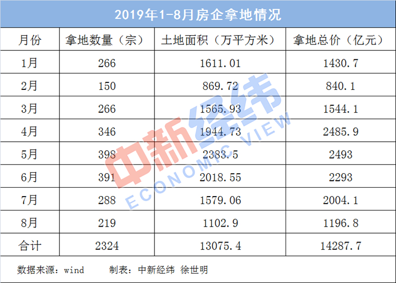 wind数据显示,今年1-8月份,房企拿地总价达14288亿元。分月份来看,自4月及5月达到高峰后,开始逐步回落,而房企8月份拿地总价与7月份相比下滑逾40%。