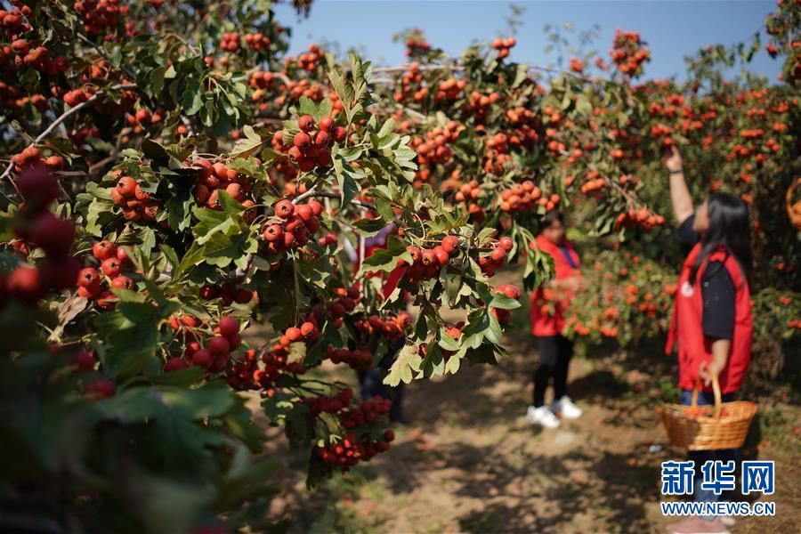 9月26日,在河北清河县马屯万亩山楂观光旅游区,村民正在参加“山楂采摘大赛”。 当日,河北清河县山楂采摘节在马屯万亩山楂观光旅游区开幕。当地村民举行了“山楂采摘大赛”“夹山楂接力赛”“挑山楂筐赛跑”等活动,在互动体验中庆祝丰收。近年来,清河县结合当地特色产业,努力打造乡村生态旅游品牌。目前马屯山楂已发展到2万多亩,年产山楂7.5万吨,带动了13个村2100多户种植户致富增收。 新华社记者 巩志宏 摄