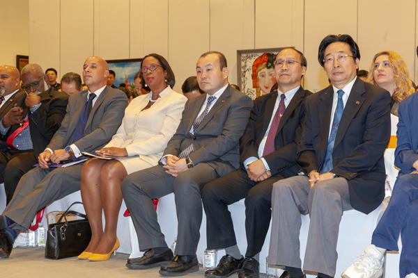中国和平发展基金会副秘书长王华和巴巴多斯外交外贸部内部长桑德拉·哈斯本兹分别发表致辞,中国驻巴巴多斯大使馆特命全权大使延秀生和中国美术家协会分党组书记、驻会副主席徐里发来贺词。