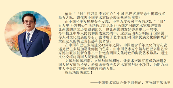 中国和平发展基金会副秘书长王华致辞表示,中国艺术家宁钢和巴巴多斯艺术家博兰为中国-巴巴多斯纪念封的创作联袂,相映成辉的东方文明与独具特色的加勒比文化的结合,在两位艺术家合作的陶瓷瓷盘画面上尽显出彩。希望通过此项活动增进中巴两国国家间、人民间的传统友谊与互相了解,促进双边友好合租关系的深入发展。