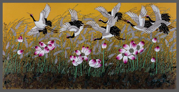 宁钢作品《岁岁和合》,画的是麦穗、仙鹤和荷花,用富有民族特色的艺术表达方式展现中华民族伟大复兴,用经典的艺术符号展现中华民族的自豪感。此画作多次出现在APEC会议等重要的场合,被世界很多国家和名人所收藏。