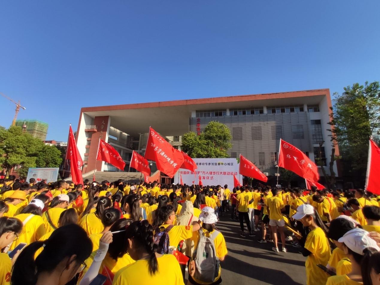 9月22日,宜春中心城区“庆国庆·展风采”万人健步行大联动活动宜春学院片区启动仪式在宜春学院举行,全校600余名大学生与教师代表一起,身着统一的文化衫,按照规定路线行进至状元洲公园,在行进队列中高举旗帜,并挥动手中红色小国旗,用“青春告白祖国 青春献给祖国”“青春心向党 建功新时代”等标语抒发对祖国的热爱,用实际行动践行活动宗旨。