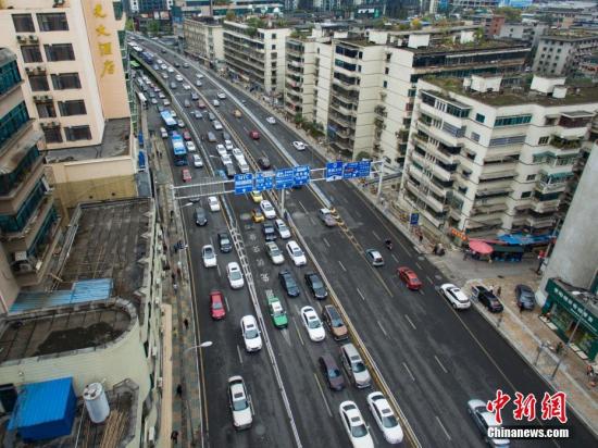 资料图:航拍一路段堵车情况。 中新社记者 贺俊怡 摄