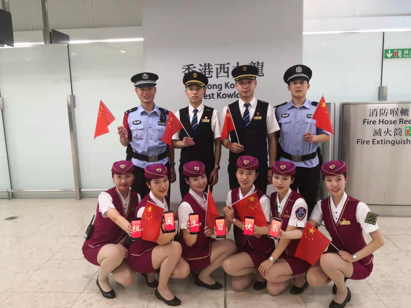 天津客运段“津港”高铁列车值乘人员,在香港西九龙站迎国庆祝福祖国