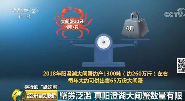 记者发现,在网购平台上,大部分蟹券上都号称卖的是阳澄湖大闸蟹。如果以每份大闸蟹10只,每只平均4两来计算,一份4斤,2018年阳澄湖大闸蟹约产1300吨左右,也就意味着每年大约可供出售65万份大闸蟹。