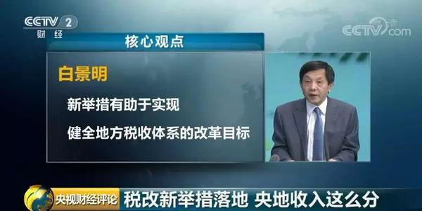 中国财政科学研究院副院长 白景明:健全地方税收体系的改革目标,是十八届三中全会提出来的,在当下实施更大规模减税降费的背景下,也提供了一个加快改革步伐的契机,就是联动调整中央与地方收入划分的关系,尤其是这次调整启动了将原来中央的一些税种下放给地方,虽然是渐进式的,但这个启动以后,后边就会有连续、有突破性意义。