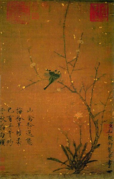 在绘画作品上题诗,始于北宋末年。现存北宋皇帝宋徽宗赵佶的《腊梅山禽图》上有自题诗:“山禽矜逸态,梅粉弄轻柔。已有丹青约,千秋指白头?!倍悦霞帷赌纪肌飞系淖蕴馐骸傲孪婧馐钇?,幽香一喷冰人清。曾将移入浙西种,一岁才华一两茎?!北硐至俗髡吖掳恋那榛?。