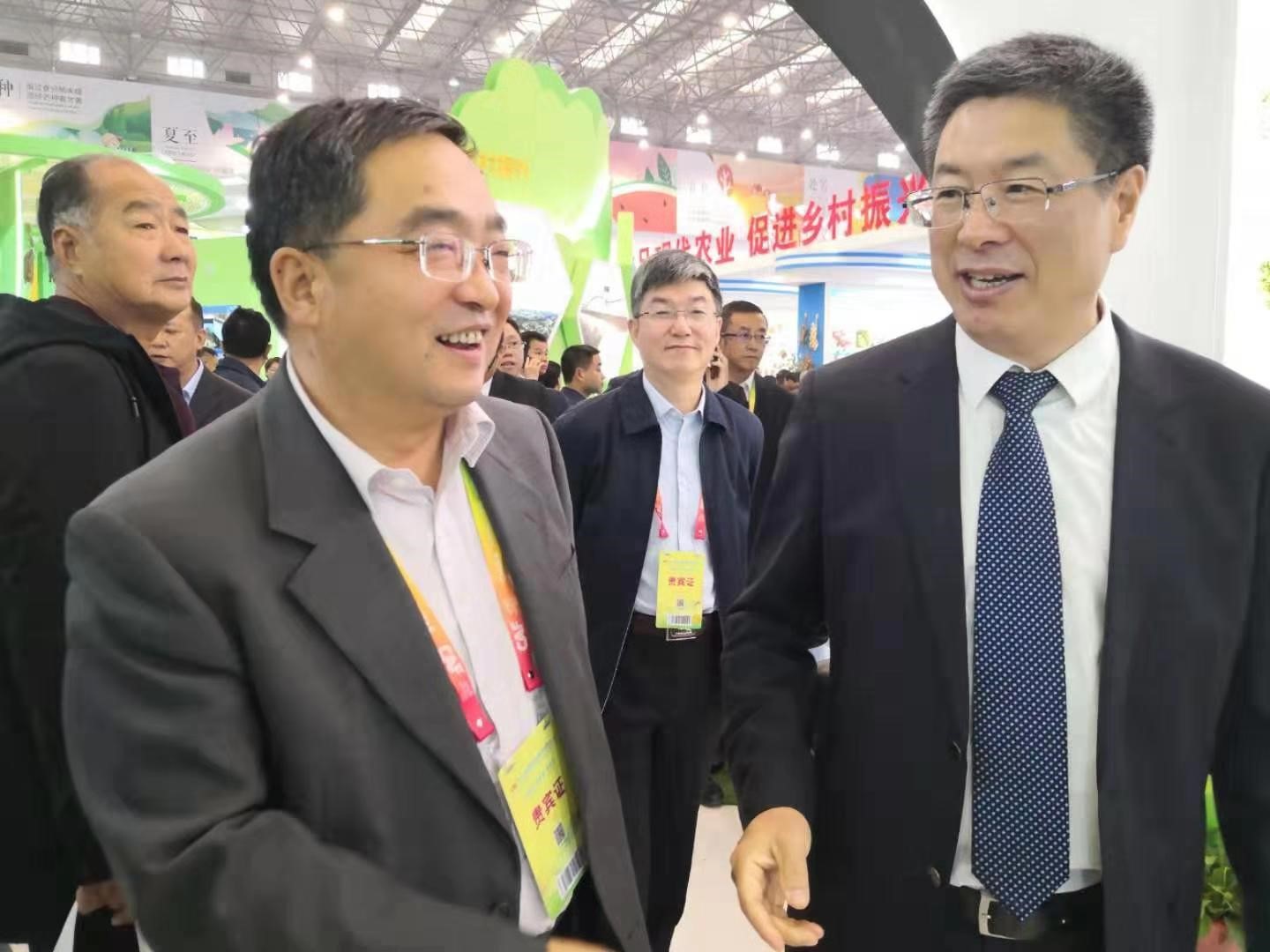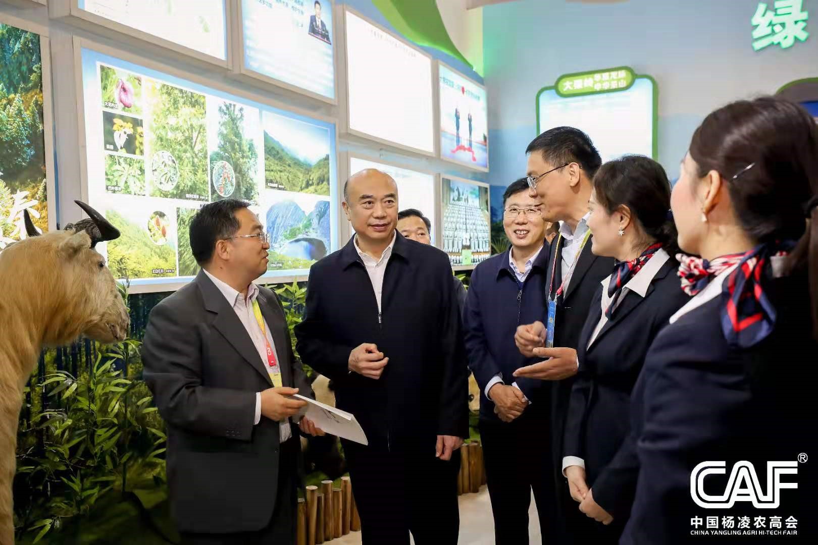 国家林业和草原局副局长彭有东(右)在第26届杨凌农高会上到陕西林业馆参观考察。杨林/摄影