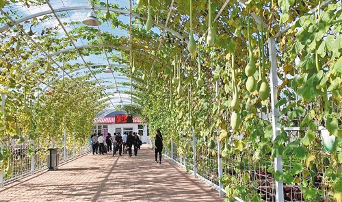 京赤科技扶贫示范园绿色连廊的藤架上,长柄葫芦十分新奇。示范园的玻璃连栋温室、日光温室里,人们利用现代化农机设备和先进技术,开展蔬菜新品种的育苗工作。经济日报·中国经济网记者 潘笑天摄