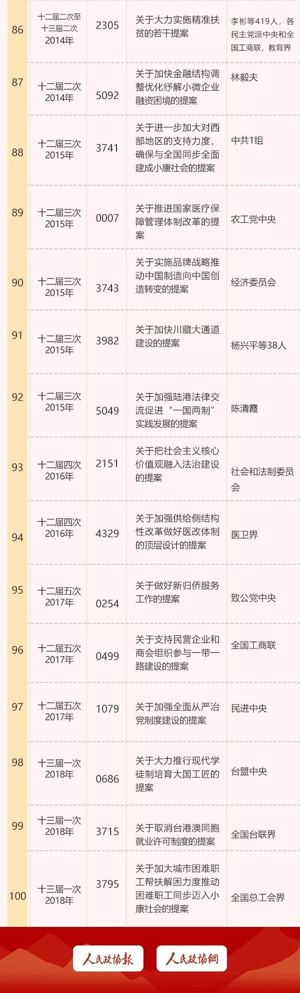 为充分展示人民政协成立70年来提案发挥的独特作用和产生的重要影响,在各民主党派中央和全国工商联、有关人民团体、全国政协各专门委员会以及各?。ㄗ灾吻?、直辖市)政协和副省级市政协广泛推荐的基础上,政协第十三届全国委员会开展了评选工作。经全国政协主席会议审议,决定对《请政府明定10月1日为中华人民共和国国庆日以代替10月10日的旧国庆日的建议案》等100件全国政协成立以来有影响力重要提案予以表彰。