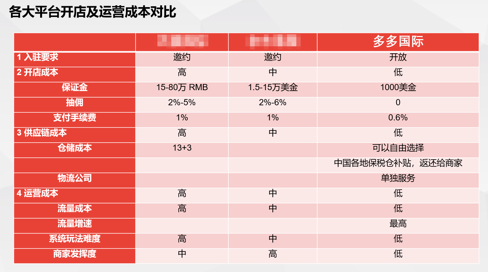 各大跨境平台的对比信息显示,拼多多全球购具有明显的成本优势