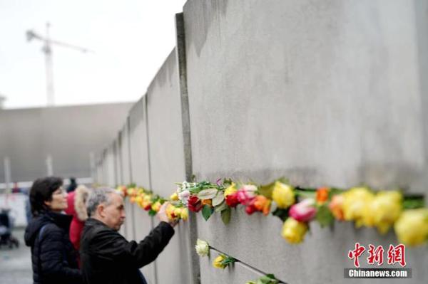 11月9日是柏林墙倒塌30周年纪念日,当天在德国首都柏林等地举行了多种纪念活动。图为游人当天在主要纪念场所之一、柏林火车北站外的柏林墙遗址纪念公园内一面插满玫瑰花的柏林墙遗迹前拍照留念。中新社记者 彭大伟 摄