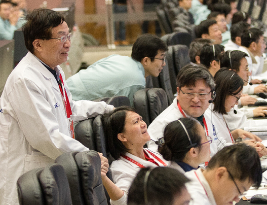 1月3日,嫦娥四号成功落月的那一刻,74岁的叶培建(左一)静静走到嫦娥四号探测器项目执行总监张熇的身后,对她表示祝贺和鼓励。两代“嫦娥人”的手紧紧握在了一起。记者 金立旺 摄