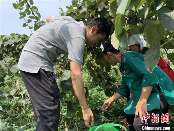 图为马玉飞与当地农户采摘猕猴桃 袁超 摄