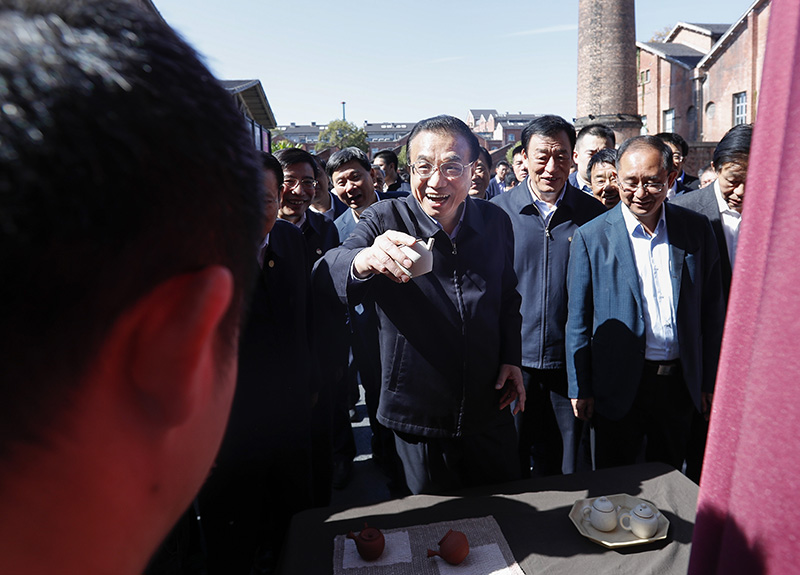 李克强11月14日考察江西景德镇。近年来景德镇陶瓷产业吸引了3万多“景漂”,其中5千多是“洋景漂”。总理来到脱胎于原国营宇宙瓷厂的陶溪川陶瓷文化创意产业园,仔细观赏工艺大师们的作品后说,瓷器浓缩了中国传统文化极致的审美趣味和工匠精神,你们继承的不仅是古老精湛的技艺,更是源远流长的文明,希望你们毫无保留地传承下去。陶溪川园区里到处是争奇斗趣的店铺和创意集市。李克强不时驻足与年轻的创客们交谈。总理称赞道,你们这里的创意产品真可以说是与众不同,千姿百态。他说,中国是瓷器的发明国,但目前我们在高端瓷方面与一些国家有了差距。希望你们既师承古人精髓,又萃取海外精华,创出一片新天地,创出千年瓷都新风光,打造国际瓷都。