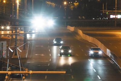 11月12日,安定门外大街主路,耀眼的监控补光灯照射车辆。新京报记者 李凯祥 摄