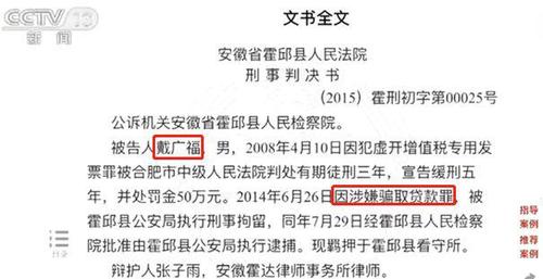 此外,记者从相关部门了解到,戴广福因通过收集他人身份证、户口簿复印件、伪造他人临时居民身份证、伪造他人户口簿、私刻他人公章,以其本人名义或冒用他人名义借款或担保,骗取安徽省霍邱县境内17个信用社贷款,实际拿走贷款资金共计19308111.79元。戴广福因骗取贷款罪,被法院判处有期徒刑5年零6个月,目前正在服刑。
