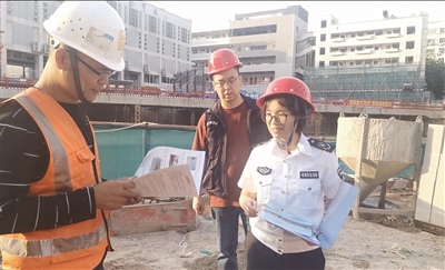 杨超琼(右一)指导施工工地落实扬尘污染防治措施。