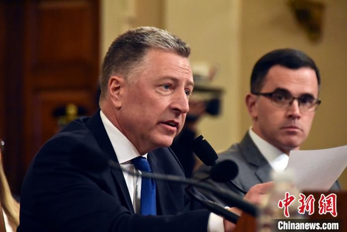 当地时间11月19日,美国国会众议院情报委员会举行两场针对美国总统特朗普的弹劾调查听证会。图为前美国驻乌克兰特别事务代表沃克(左)和前美国国家安全委员会高级官员莫里森(右)出席当日听证会。中新社记者 沙晗汀 摄
