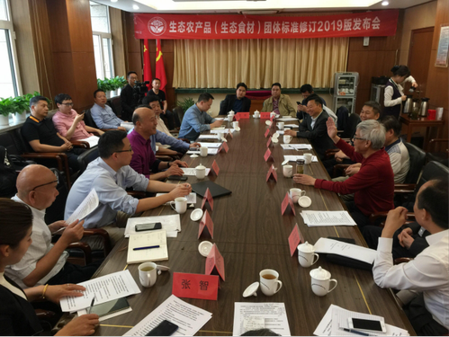 2019年5月4日,《生态农产品(生态食材)团体标准2019(修订)版》发布会在国资委商业机关局1号楼会议室召开。该标准是由中国工程院院士印遇龙作为牵头人,由商业饮食服务业发展中心、中国科学院亚热带农业生态研究所、中国农业资源与区划学会、中国地名学会文旅委员会、中咨国业规划设计中心、贵州省有机农业学会、重庆市有机农业产业协会等单位共同起草和发布实施的?;嵋榛苟陨?、生态饲料、生态农业园区(农场/庄园)团体标准进行了研讨。