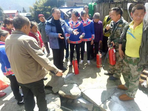 图为陈步飞书记在组织开展村寨消防安全演练。