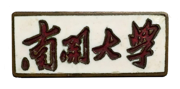 中华人民共和国成立后,南开大学制发了矩形校徽,单色背景,镌有毛泽东题字的“南开大学”校名。此种校徽有多种款式,早期文字多为红色,背景色根据不同身份有所区分,有白、红、蓝、黄、绿等不同颜色,如红字白底、白字红底、白字黑底等等,并有椭圆形?;?,比较独特。图2为上世纪五六十年代南开大学?;?。