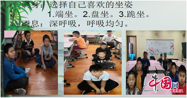 端正学生坐姿调身,调身也就是将身体的姿势、动作调整到舒适、稳定、伸展的状态,身正方能心正。只有把身体调正了,心才能调正。保持良好的坐姿,不要像一摊泥一样的坐,最好只坐椅子的三分之一,时刻记着挺胸收腹 。调息,做到深呼吸,呼吸均匀深长。调身调息的目的是为了调心!学生自由选择喜欢的坐姿!