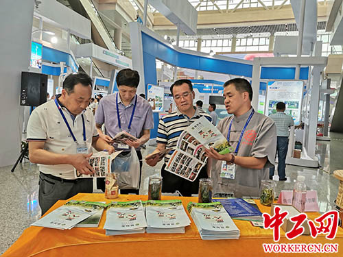 陈加友(右一)向客商介绍茶叶机械智能产品。