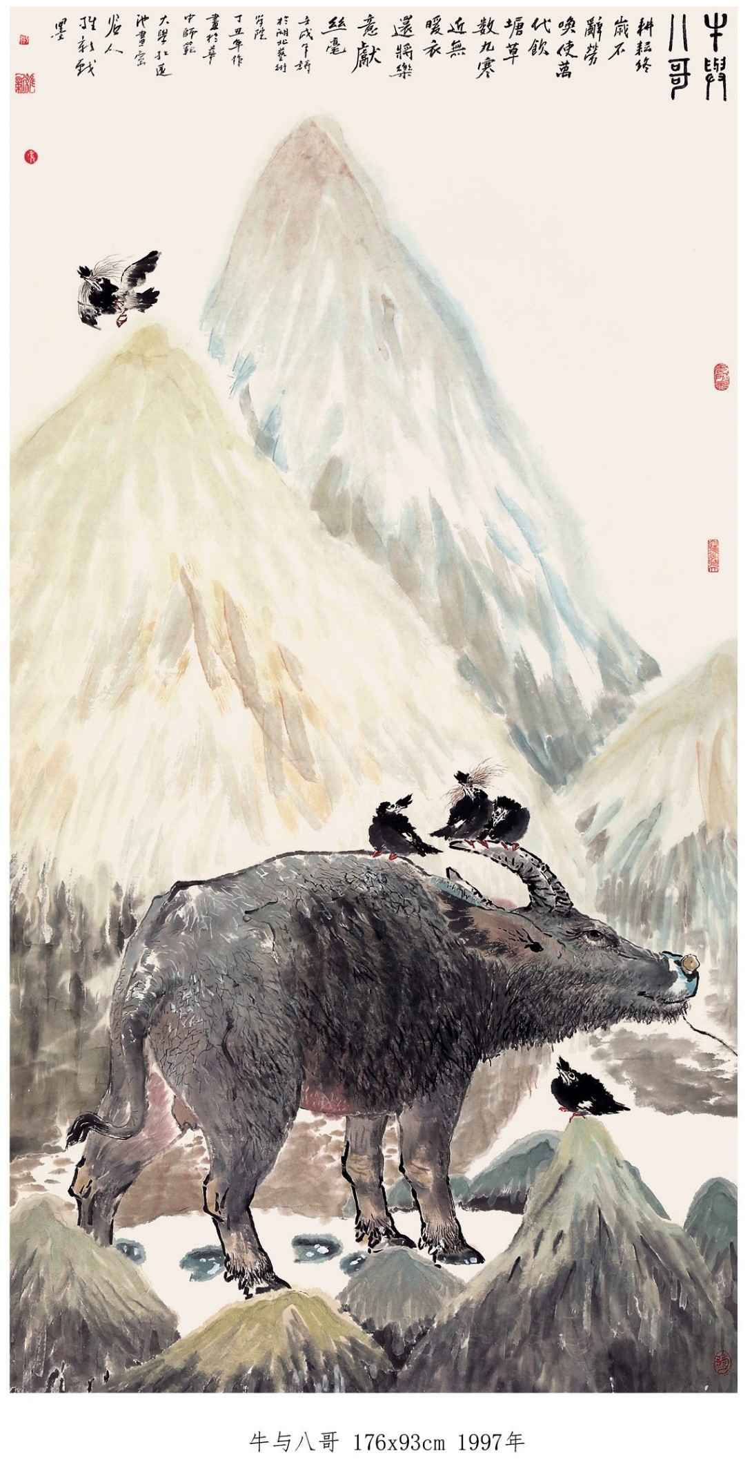 1997年9月,构思15年后创作国画《牛与八哥》。