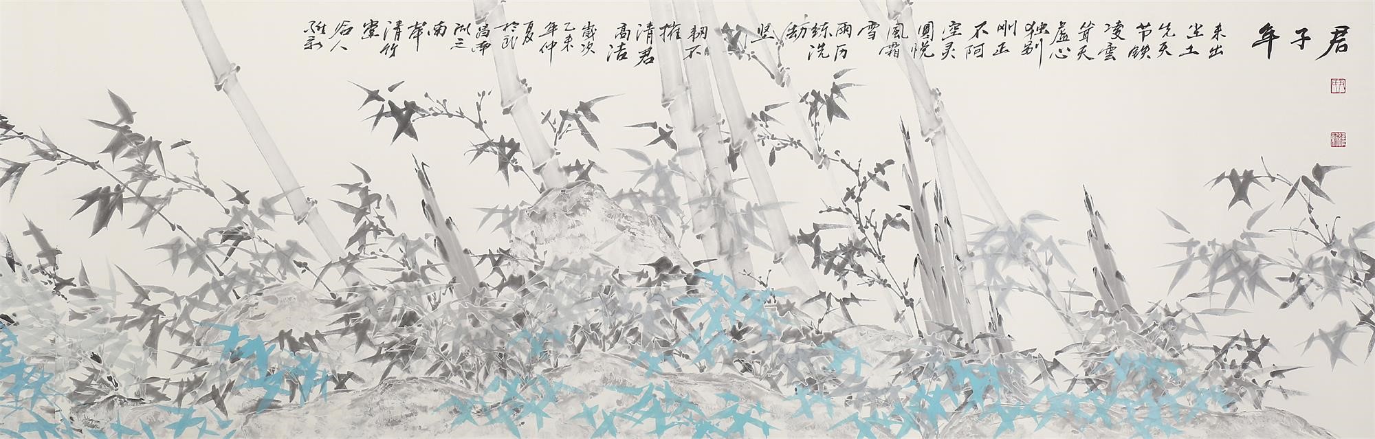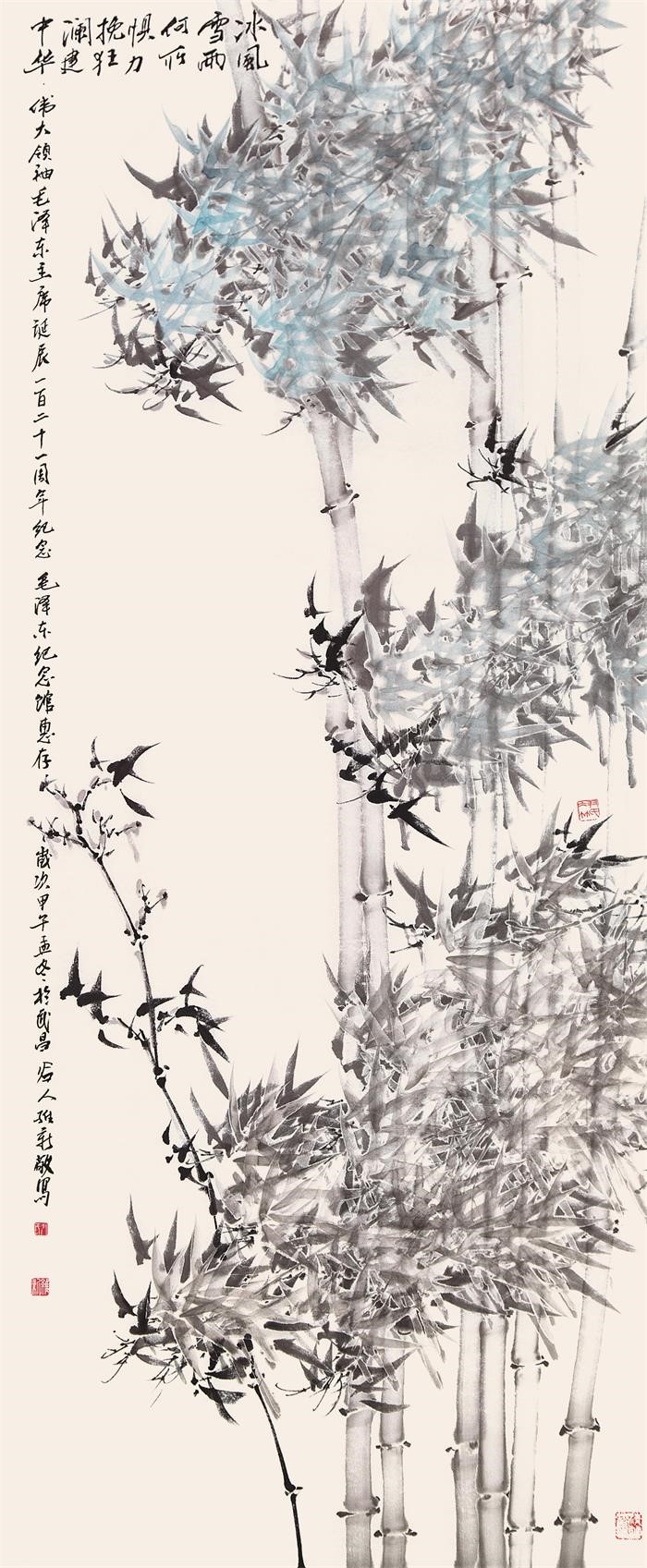尹维新所绘“冰竹”,并不是竹子在冰雪中的原型原貌,而是经过了艺术的再现,呈现出的他心中之竹。与现实生活中损败垂折的冰竹不同,在尹维新的画中,“冰竹”永远不屈不挠、昂首挺立,就像他在9米长手卷作品《君子年》中题画诗所记述的“冰竹”特色: